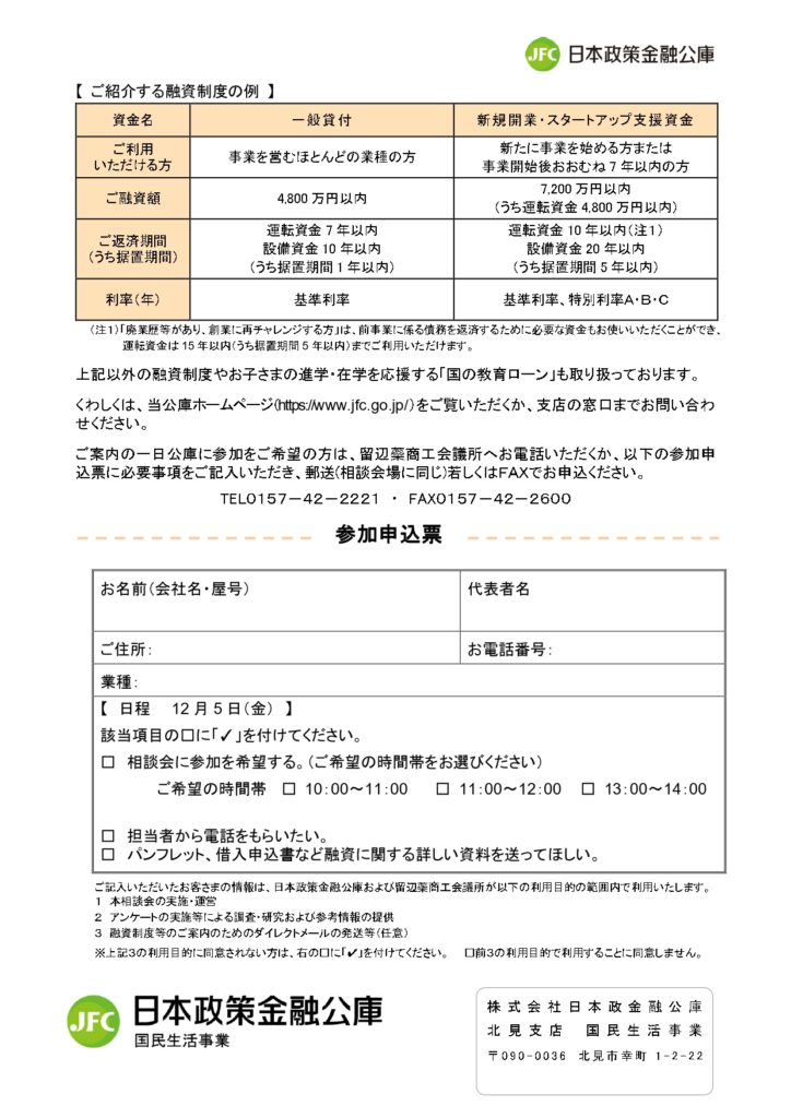留辺蘂商工会議所にて、日本公庫の融資担当者が融資や事業に関するご相談をお受けします。